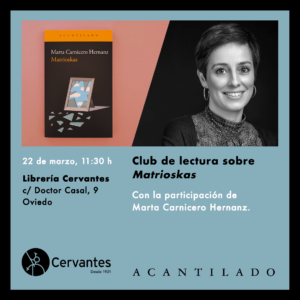 El sábado 22 de marzo a las 11:30 h tendrá lugar un club de lectura sobre Matrioskas en la librería Cervantes. El acto contará con la participación de la autora Marta Carnicero Hernanz.
