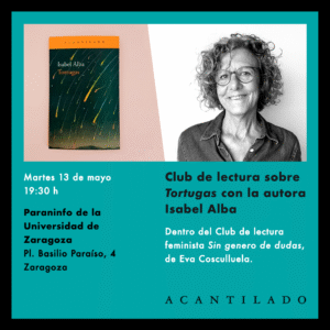 El martes 13 de mayo a las 19:30 h tendrá lugar un club de lectura sobre Tortugas en la Sala Pilar Sinués del edificio Paraninfo (Universidad de Zaragoza). El acto contará con la participación de la autora, Isabel Alba.