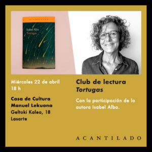 El miércoles 22 de abril a las 18 h tendrá lugar un club de lectura sobre Tortugas en la Casa de Cultura Manuel Lekuona de Lasarte. El acto contará con la participación de la autora, Isabel Alba.