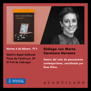 Marta Carnicero, autora de Matrioskas, participará en el diálogo Cuando el conflicto nos convierte en bestias dentro del ciclo de pensamiento contemporáneo, coordinado por Rosa Ribas, el próximo martes 4 de febrero en Cèntric Espai Cultural a las 19 h.