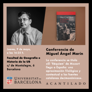 Miguel Ángel Marín participará en el ciclo de conferencias III Jornades Internacionals de Patrimoni Musical. Música urbana, oratori (espai i música), i art sacre el próximo jueves, 9 de mayo, de 16:25 a 16:50 h. La conferencia se titula El ‘Réquiem’ de Mozart llega a España: una aproximación filológica y contextual a las Fuentes catalanas decimonónicas y su moderador es el profesor Oriol Brugarolas Bonet.