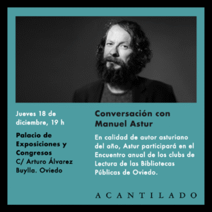 El jueves 18 de diciembre tendrá lugar el Encuentro anual de los Clubs de Lectura de las Bibliotecas Públicas de Oviedo en el Palacio de Exposiciones y Congresos. Este año el autor asturiano invitado será Manuel Astur.