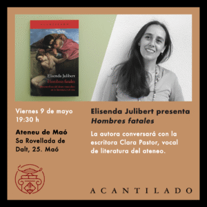 La escritora Elisenda Julibert presentará el ensayo Hombres fatales en el Ateneu de Maó el viernes 9 de mayo a las 19:30 h. La autora conversará con la escritora Clara Pastor, vocal de literatura del ateneo.