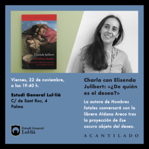El viernes 22 de noviembre, tras la proyección de «Ese oscuro objeto del deseo», tendrá lugar la conversación «¿De quién es el deseo?» entre la escritora Elisenda Julibert, autora de Hombres fatales, y Aldana Areco, de la Llibreria Propia. El evento tendrá lugar en el Estudi General Lul·lià a las 19:40 h.