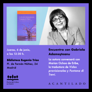 La escritora Gabriela Adameșteanu charlará con Marian Ochoa de Eribe, la traductora de Vidas provisionales y Fontana di Trevi. El evento será a las 12:30 h en la Biblioteca Eugenio Trías.