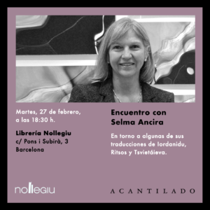El martes 27 de febrero a las 18:30 h, la traductora Selma Ancira charlará con sus lectores en la librería Nollegiu de Barcelona. En el encuentro, charlarán sobre lordanidu, Ritsos y Tsvietáieva.