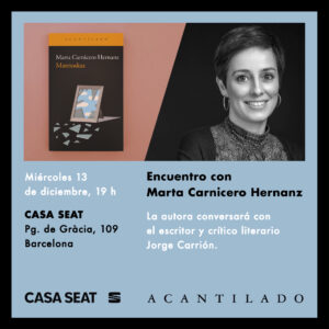 La escritora Marta Carnicero Hernanz, autora de Matrioskas, conversará con el escritor y crítico literario Jorge Carrión el miércoles 13 de diciembre a las 19 h en CASA SEAT. La conversación será sobre su proceso creativo, sus influencias estilísticas y las obras que configuran su carrera literaria.