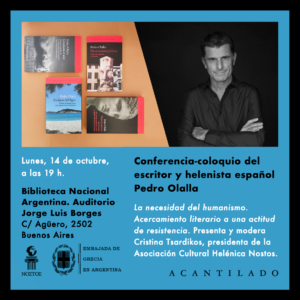 El lunes 14 de octubre a las 19 h, el escritor Pedro Olalla visitará la Biblioteca Nacional Argentina. Conversará con Cristina Tsardikos, presidenta de la Asociación Cultural Helénica Nostos, en el coloquio titulado La necesidad del humanismo. Acercamiento literario a una actitud de resistencia. El evento está auspiciado por la Asociación Cultural Helénica Nostos y la Embajada de Grecia en Argentina.