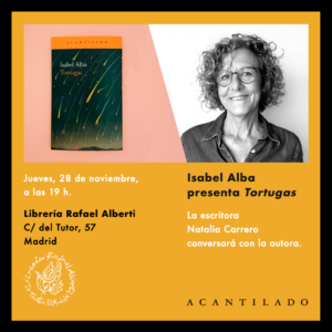 El jueves 28 de noviembre la escritora Isabel Alba presentará su última novela, Tortugas, en la librería Rafael Alberti a las 19 h. La escritora Natalia Carrero conversará con la autora.