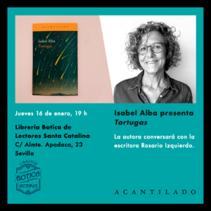 El jueves 16 de enero la escritora Isabel Alba presentará su última novela, Tortugas, en la librería La Botica de Lectores Santa Catalina a las 19 h. La escritora Rosario Izquierdo conversará con la autora.