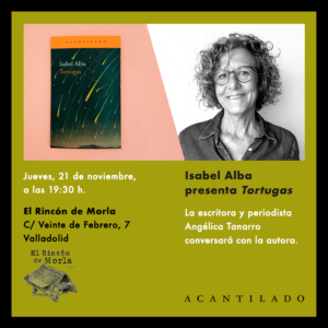 El jueves 21 de noviembre la escritora Isabel Alba presentará su última novela,Tortugas, en la librería El Rincón de Morla a las 19:30 h. La escritora y periodista Angélica Tanarro conversará con la autora.