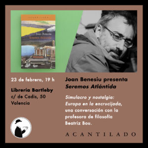 El escritor Joan Benesiu presentará la novela Seremos Atlántida el jueves 23 de febrero a las 19 h en la Librería Bartleby. El autor estará acompañado de la profesora de filosofía Beatriz Bou.