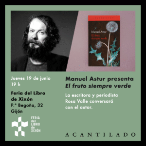 El escritor Manuel Astur presentará El fruto siempre verde el jueves 19 de junio en la Feria del Libro de Xixón a las 19 h. La escritora y periodista Rosa Valle conversará con el autor.
