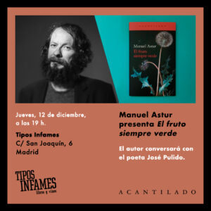 Manuel Astur presentará su último libro, El fruto siempre verde, el próximo jueves 12 de diciembre a las 19 h. El evento tendrá lugar en la librería madrileña Tipos Infames, en el espacio dedicado a la poesía. El autor estará acompañado por el poeta José Pulido.