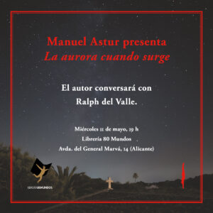 El próximo miércoles 11 de mayo el escritor Manuel Astur presentará su último libro, La aurora cuando surge, en la Librería 80 Mundos de Alicante a las 19 h. El autor conversará con Ralph del Valle.