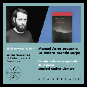 El viernes 18 de noviembre el escritor Manuel Astur presentará su último libro, La aurora cuando surge, en la librería Letras Corsarias de Salamanca a las 20 h. El autor estará acompañado de la poeta Maribel Andrés Llamero.