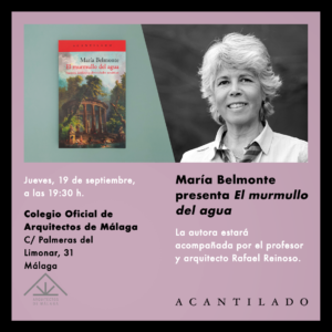 La escritora María Belmonte presentará su último libro, El murmullo del agua, el próximo jueves 19 septiembre. La autora estará acompañada por el profesor y arquitecto Rafael Reinoso. El evento será en el Colegio Oficial de Arquitectos de Málaga a las 19:30 h.