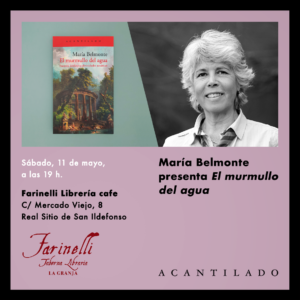 La escritora María Belmonte presentará su último libro, El murmullo del agua, el próximo sábado, 11 de mayo. El evento será en la librería Farinelli a las 19 h.