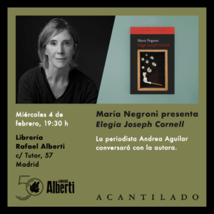 La escritora María Negroni presentará Elegía Joseph Cornell en la librería Rafael Alberti el miércoles 4 de febrero a las 19:30 h. La periodista Andrea Aguilar conversará con la autora.