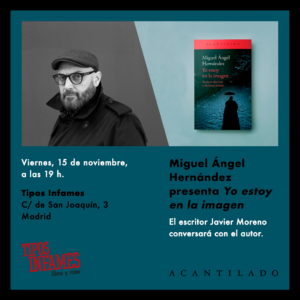 Miguel Ángel Hernández presentará su última obra, Yo estoy en la imagen, el próximo viernes 15 de noviembre. El evento será en la librería Tipos Infames a las 19 h. El escritor Javier Moreno conversará con el autor.