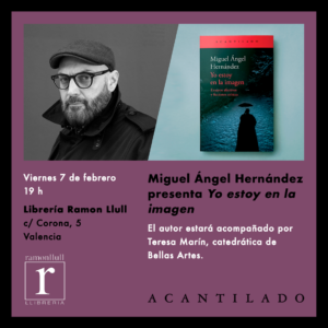 Miguel Ángel Hernández presentará su última obra, Yo estoy en la imagen, el viernes 7 de febrero. El evento será en la librería Ramon Llull a las 19 h. Acompañará al autor Teresa Marín, catedrática de Bellas Artes.