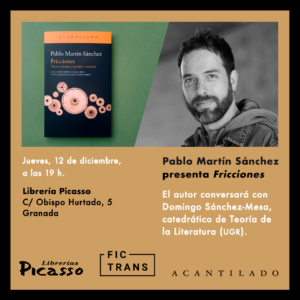 Pablo Martín Sánchez presentará Fricciones el próximo jueves 12 de diciembre. El evento tendrá lugar en la librería Picasso a las 19 h. El autor conversará con Domingo Sánchez-Mesa, catedrático de Teoría de la Literatura (UGR).
