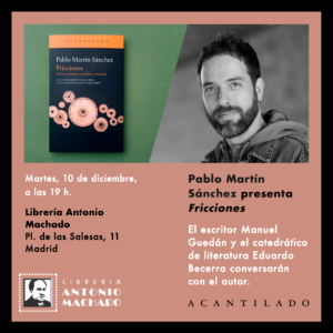 Pablo Martín Sánchez presentará Fricciones el próximo martes 10 de diciembre. El evento tendrá lugar en la librería Antonio Machado a las 19 h. El escritor Manuel Guedán y el catedrático de literatura Eduardo Becerra conversarán con el autor.