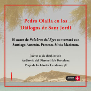 El próximo jueves 21 de abril el escritor Pedro Olalla, autor del reciente ensayo Palabras del Egeo, participará en los Diálogos de Sant Jordi en una conversación con Santiago Auserón. Presenta Sílvia Marimon. En el auditorio del Disseny Hub Barcelona a las 18:30 h.