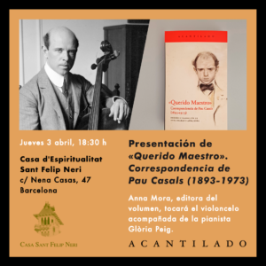 El jueves 3 de abril a las 18:30 h tendrá lugar una presentación de «Querido Maestro», la correspondencia de Pau Casals, en la Casa d’Espiritualitat Sant Felip Neri. Anna Mora, editora del volumen, tocará el violoncelo acompañada de la pianista Glòria Peig.