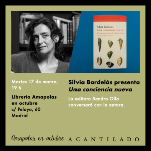 El martes 17 de marzo a las 19 h la escritora Silvia Bardelás presentará el ensayo Una conciencia nueva. La urgente pregunta de quiénes somos en la librería Amapolas en octubre. La editora Sandra Ollo conversará con la autora.