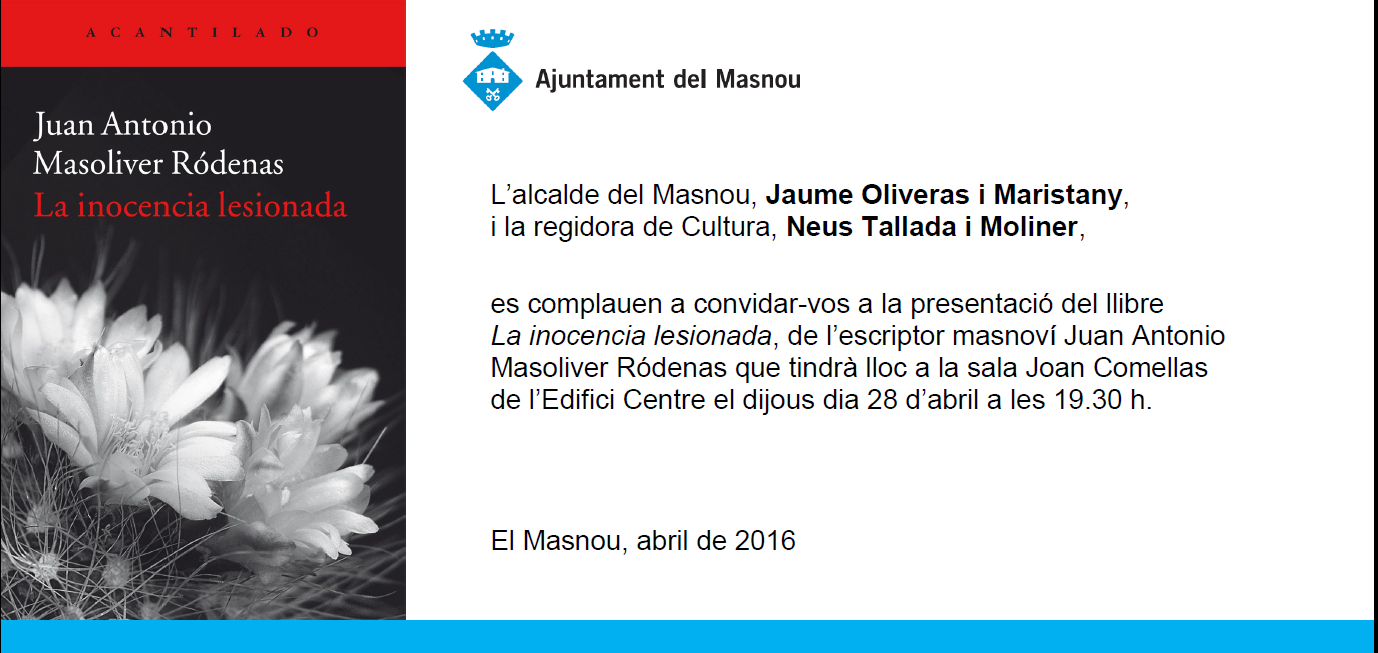 Este jueves 28 de abril, a las 19.30h Masoliver Ródenas presentará su último libro, La inocencia lesionada, en El Masnou (Barcelona), y lo hará acompañado por Jaume Oliveras, alcalde de dicha localidad.